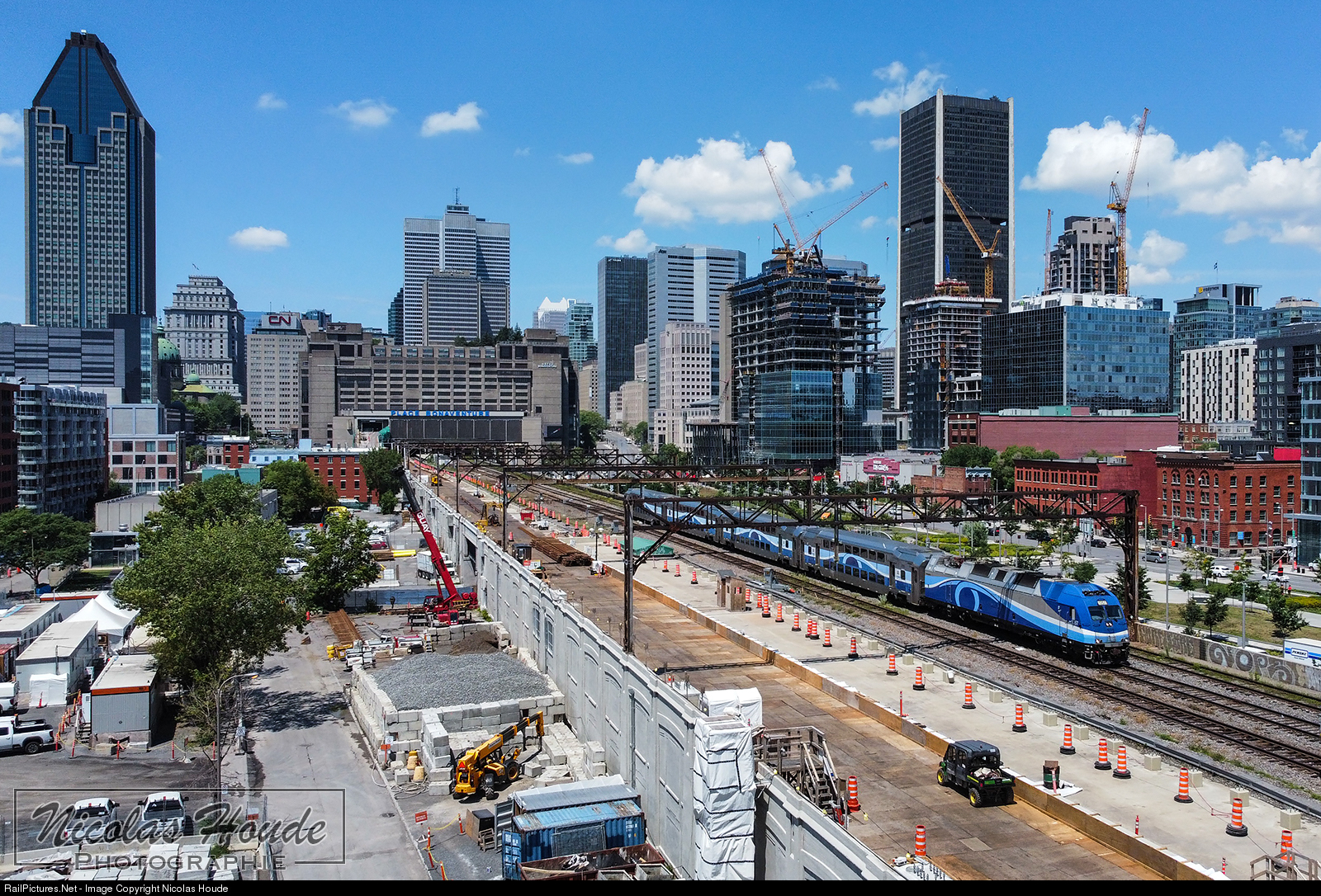 A few minutes after departing Montreal's Central Station, EXO 808 (Mont-St-Hilaire bound) is passing beside work being done for REM light rail project. In the distance at left you can see a CN noodle on CN's headquarers building. |