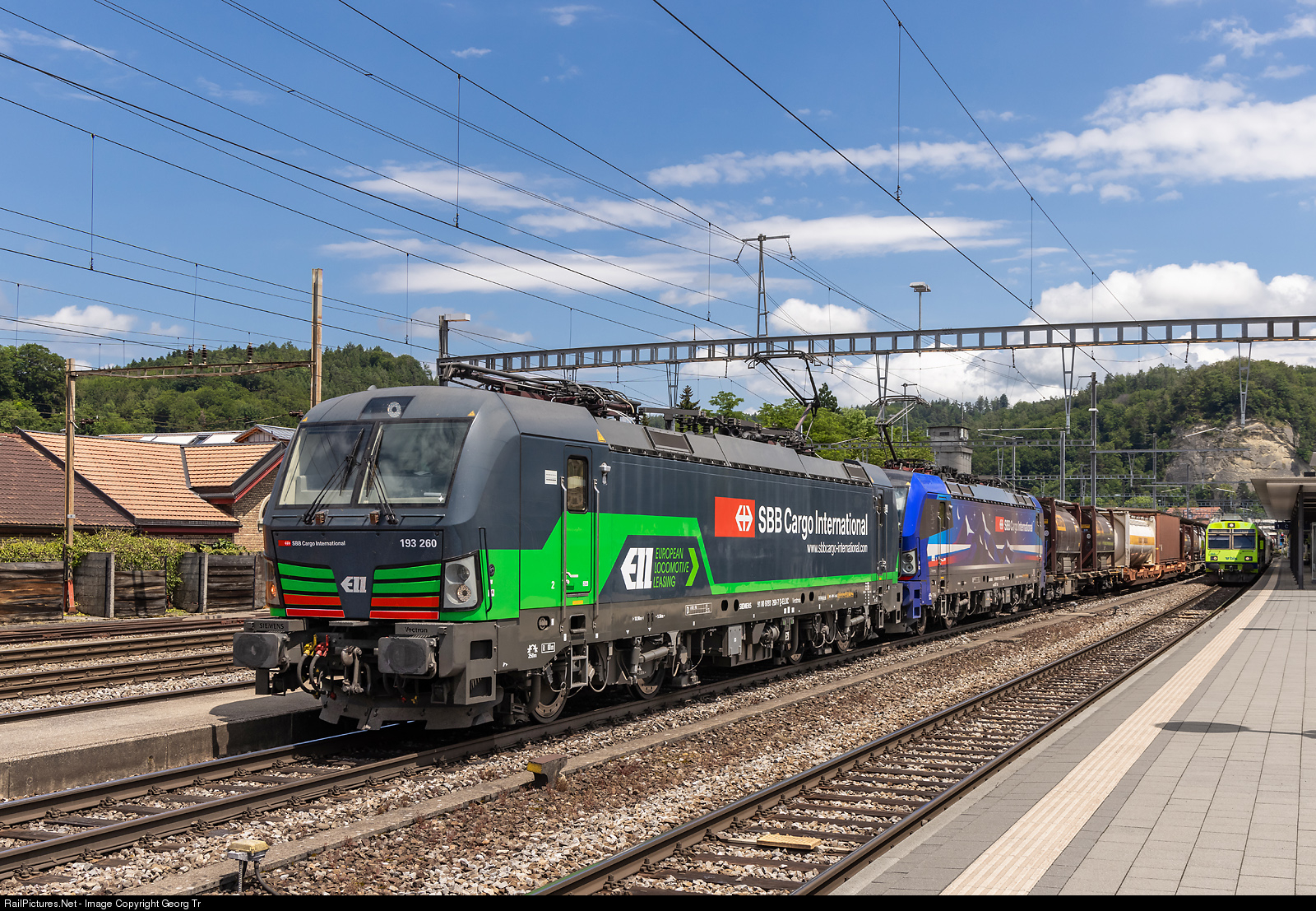 | Siemens "Vectron" 193 # 260 of the ELL (European Locomotive Leasing), rented by SBB Cargo International, and 193 # 523 "Rhein" in the "Nightpiercer" paint scheme of SBB Cargo International in multiple control, are pulling the southbound intermodal train 43701 from Hannover Lindenhafen/Germany via Lötschberg-Simplon to Novara Boschetto/Italy through Burgdorf.