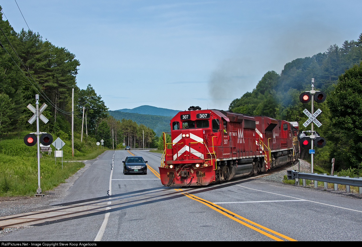 | GMRC train 263 crosses Route 103 at East Clarendon, VT after the slow steep climb out of Rutland. VTR 307, 432 and 208 |