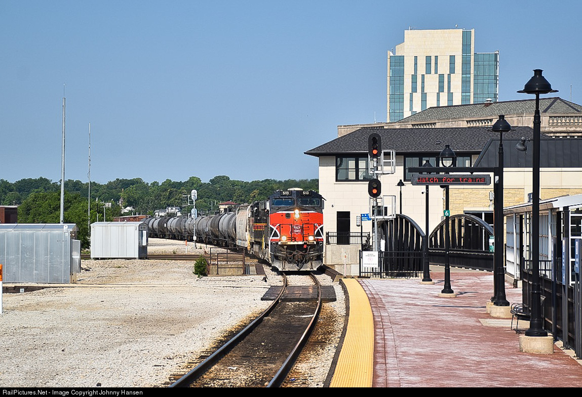 Just after Amtrak 300 rolls north over the diamonds, the morning eastbound Iowa Interstate freight, IAIS SIBI (Silvis, IL - Blue Island, IL) heads east past UD tower in Downtown Joliet. Leading the way is the Rock Island Heritage Unit, IAIS 513 leading another ES44AC, IAIS 501.
