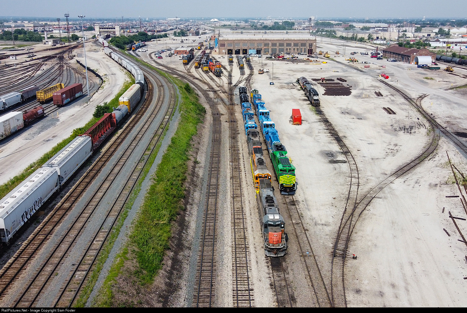 A colorful array of power is seen at the Belt Railway of Chicago’s shops in Clearing. At the front, three LTEX SD45T-2s sit next to a freshly painted New Brunswick Southern SD70M-2. On the right, a NS SD40-2 is seen with a BRC genset and an Iowa Pacific E9A.