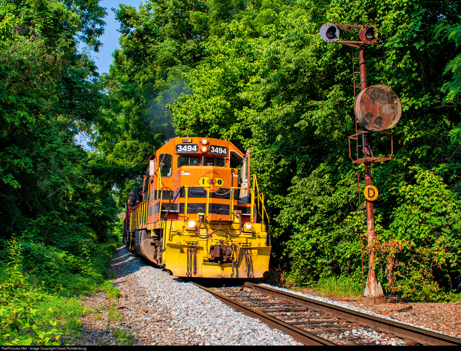 | Five Indiana & Ohio Railway EMD's on the Washington Court House Turn Job, led by former QNS&L SD40-2 No. 3494, begin their assault of Madeira Hill on the Midland Subdivision in Madisonville, passing the old B&O CPL Distant signal for the CTC territory from East Norwood to NA Tower on the former B&O Ohio Division. |