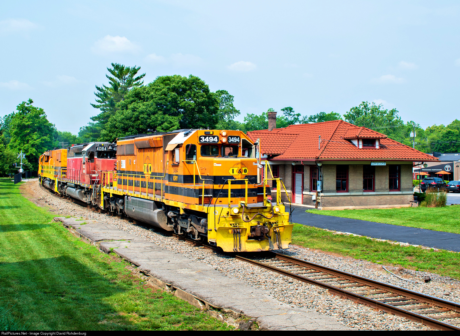 The Indiana & Ohio Railway's Washington Court House Turn Job thunders past the classic depot in Loveland on the former B&O Ohio Division mainline. The depot currently houses a running store.