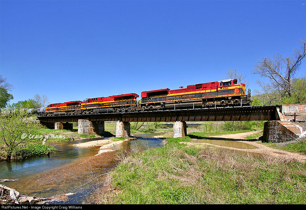 | The KC to Shreveport freight makes good time as they roll over the Sallisaw Creek just outside of Bunch. The train is working south between Marble Rock and Cave Springs on the KCS Heavener Sub. The train is about 40 miles from the crew change point at Heavener. |