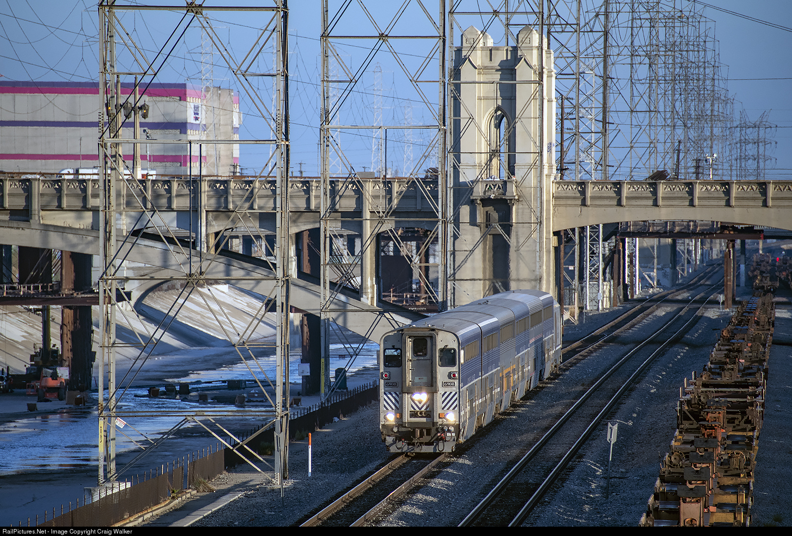 Amtrak’s Pacific Surfliner’s are rightly renowned for their view of the Pacific Ocean as they skirt the coast from San Clemente to Del Mar. But as Surfliner 785 runs along the Los Angeles River’s west bank, the view is much grittier. In moments, train 785 will arrive in Los Angeles’ Union Station and, after a suitable break, continue its journey to Goleta, near Santa Barbara, and more spectacular views of the Pacific. Well, not on this evening’s train as much, as if the passenger are lucky, they might catch a nice view of the sun dropping “into” the ocean before darkness falls. Twenty-year-old Alstom-built cab/baggage/coach 6908 (named Point Estero) is leading this six-car train now, but as it departs LA CDTX SC-44 2116 will be on the point. (Los Angeles, California – July 6, 2021)