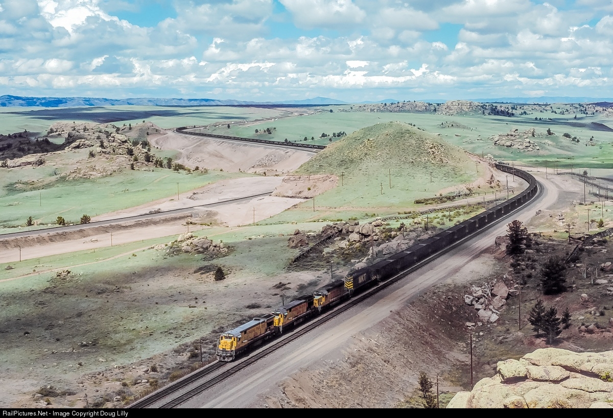 A morning spent on Union Pacific’s line over Sherman Hill at Dale Junction, Wyoming included a blue sky full of puffy white clouds. While making a nice addition to photo, those clouds cause much angst, constantly threatening to shadow a train. We were cussing the cloud that appeared over the tracks when a 106-car eastbound coal train showed up. Fortunately, the lead unit cleared the shadow, and we were able to salvage an image of the train snaking around the huge s-curve.