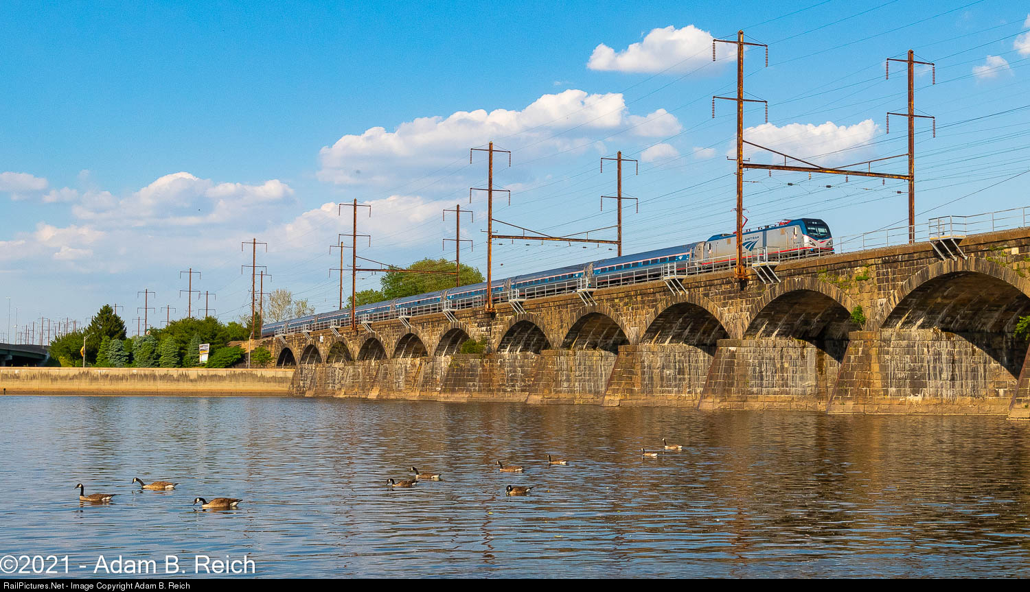 train #129 crosses the Morrisville-Trenton Railroad Bridge en route to Washington, D.C. as a gaggle of geese swims along the Delaware River below on May 27, 2021.