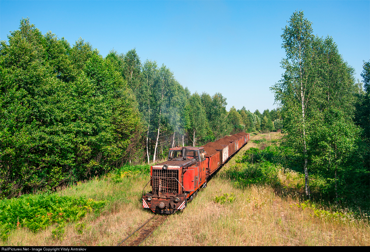 | The narrow gauge diesel locomotive TU7-1677 is leading a freight train from peat fields of Mezinovsky narrow gauge railway |