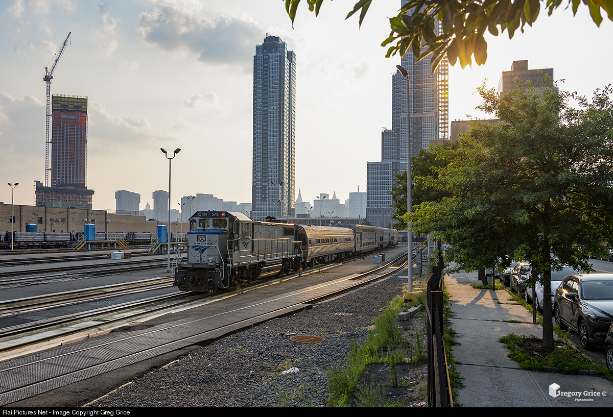 On the evening of July 7, 2021, Amtrak's Sunnyside Yard switching crew is seen retrieving the 10002 "Corridor Clipper" track geometry coach at Long Island Rail Road's Long Island City Yard with GP15D AMTK 579. This car was part of a special train that performed a round trip geometry inspection between Long Island City & Jamaica via the Main Line and Jamaica & Montauk via the Montauk Line to gather track data for potential Amtrak service in the future.