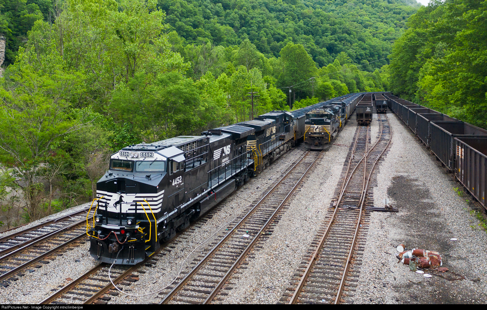 | A pair of loaded coal trains await departure from the small NS yard in Gilbert, West Virginia on the Guyandot River Branch with one sporting a factory fresh AC44C6M as the leader. |