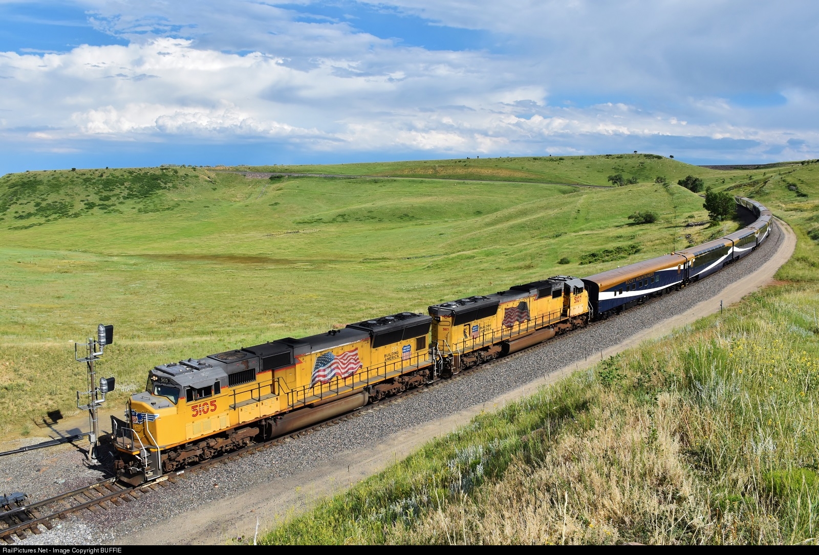| UP 5105 (SD70M) leads the Rocky Mountaineer passenger train on a test run from Denver, Colorado to Moab, Utah and back. The train will begin passenger service on August 11 and the vista dome type cars will provide an amazing view through the Colorado Rockies. |