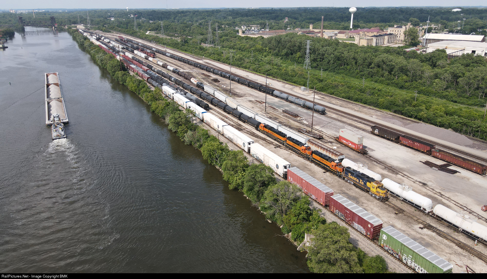 | BNSF 167 arrives in Joliet Yard to begin its work as a barge sails northbound up the Des Plaines River toward the former EJ&E lift bridge. The Statesville Prison can be seen in the distance where Jake and Elwood spent some hard time. |
