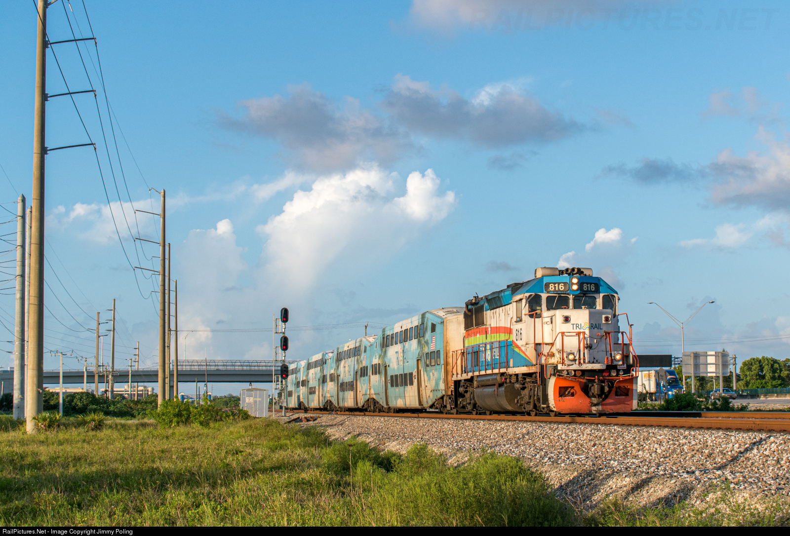 | Tri Rail GP49PH-3 816 notches up after a quick station stop at Boca Raton. The train is passing CP Pineapple on the South Florida Rail Corridor (SFRC). |