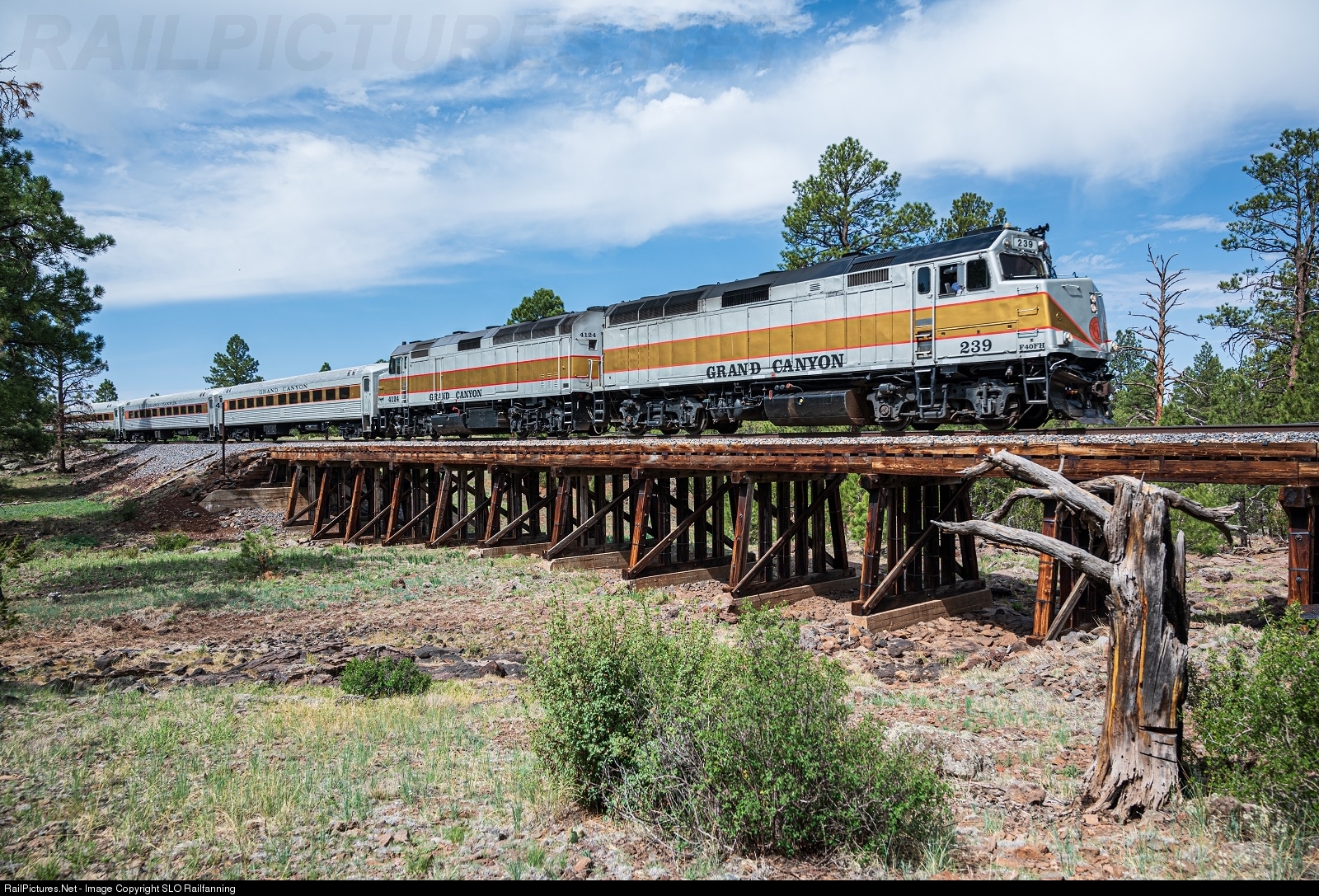 GCRY 239 crosses the trestle at MP 4, just north of the Grand Canyon Railway yard