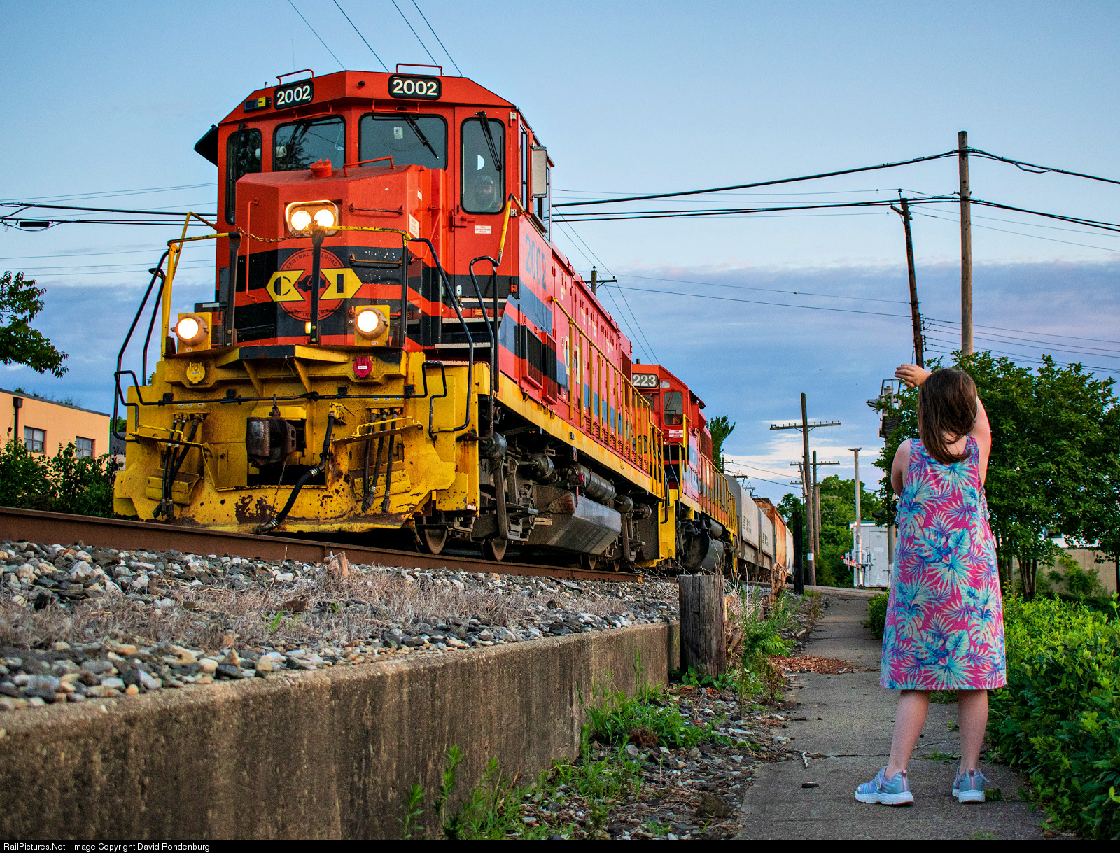 The Indiana & Ohio Railway's NS Interchange Job rolls into Reading westbound at sunset, greeted with a friendly wave by our oldest daughter.