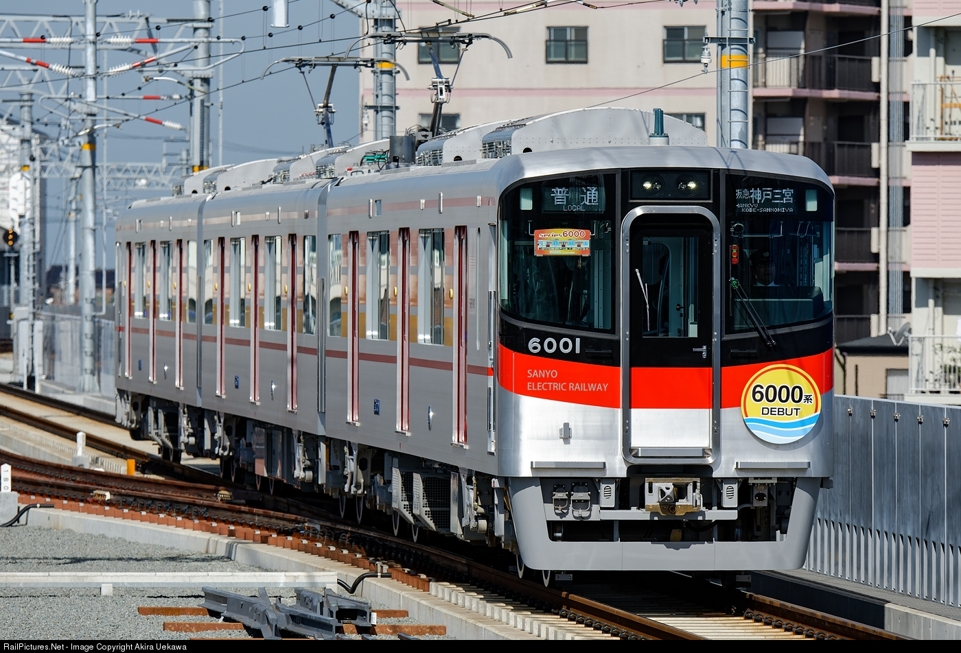 The Sanyo Electric Railway 6000 series, a brand new train type for the company that entered service in April 2016, seen here freshly approaching to Nishi-Shimmachi Station. Check out the round badge celebrating the debut. [Nikon D700, Nikkor 80-400mm F4.5-5.6]