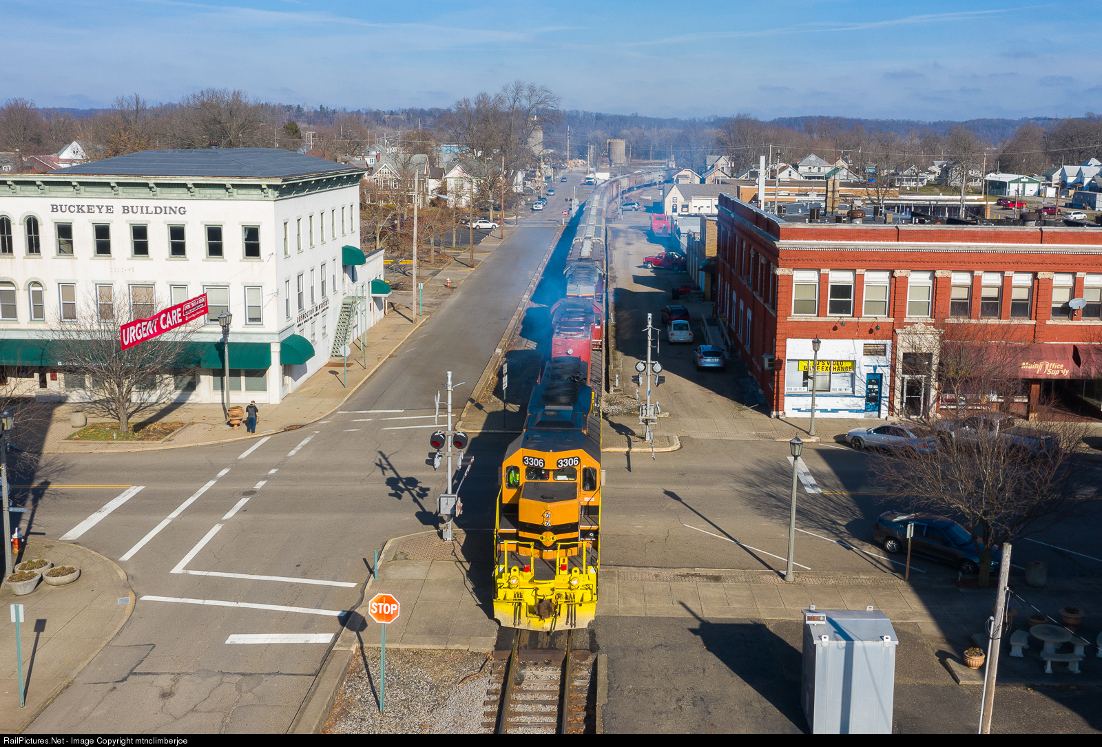 | The Ohio Central's CNL1 crew pulls out of the yard in Coshocton, Ohio as they make their double of a loaded grain train that they will take west to Newark. While not true street running, the tracks run through downtown splitting North 5th street on the left and various alleys and parking lots on the right. |
