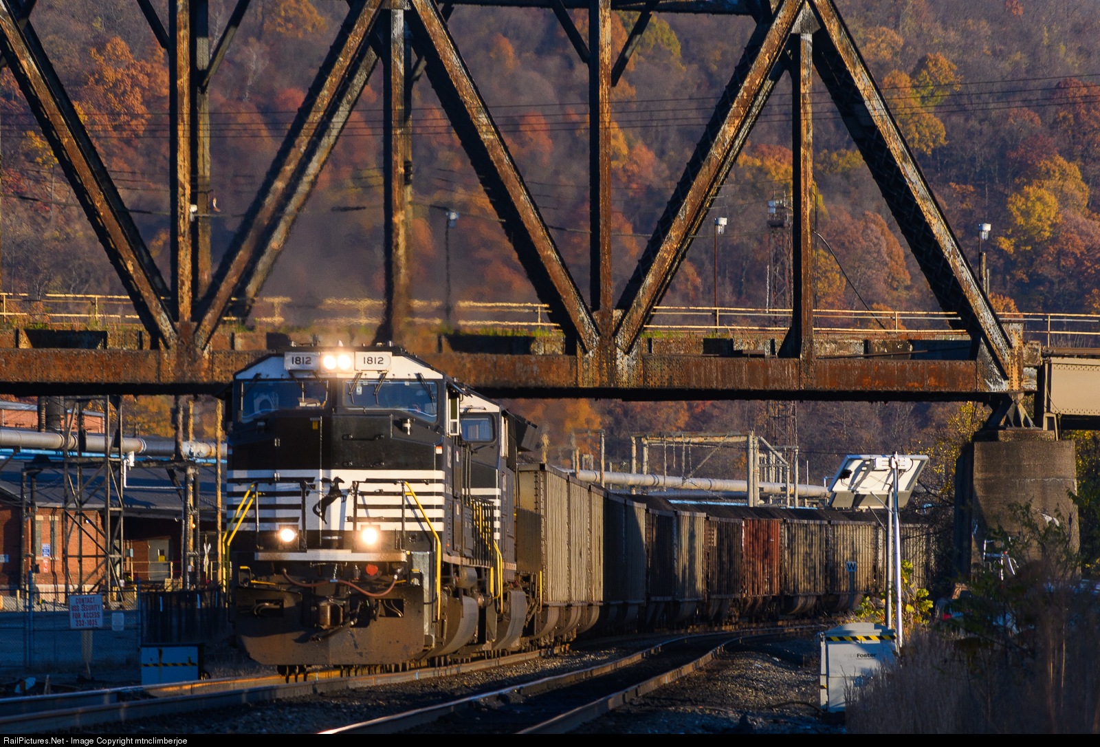 | An NS SD70ACC rebuild leads a loaded coal train as it cruises up the Mon Line through Clairton, Pennsylvania on a fall evening. The NS line passes under the WLE's Clairton Branch as it passes the USS Clairton Mill Works. |