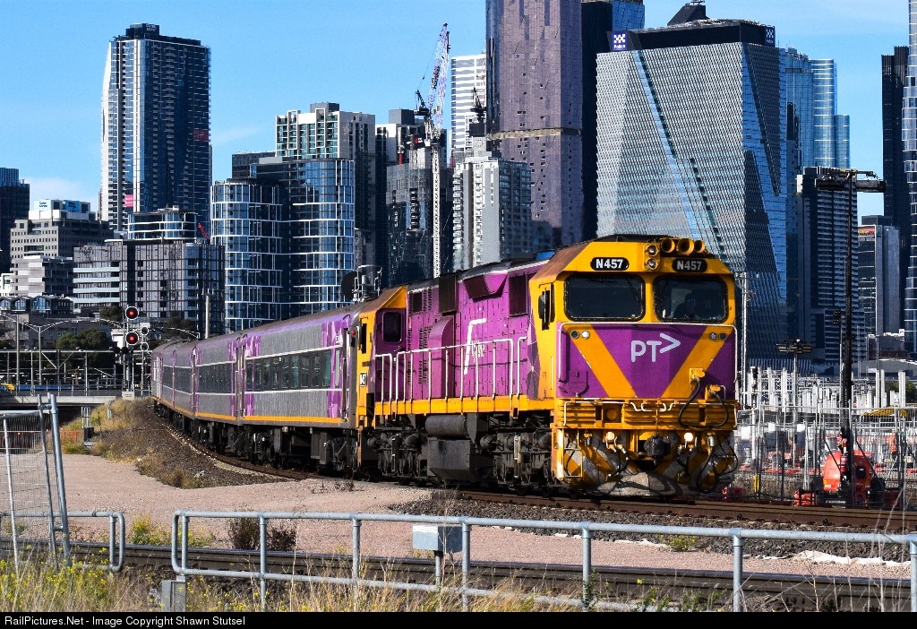 | With the city skyline in the background, V/Lines N457 approaches Moonee Ponds Creek Junction, Melbourne with 8615, Down Albury Pass Service in spectacular sunshine...