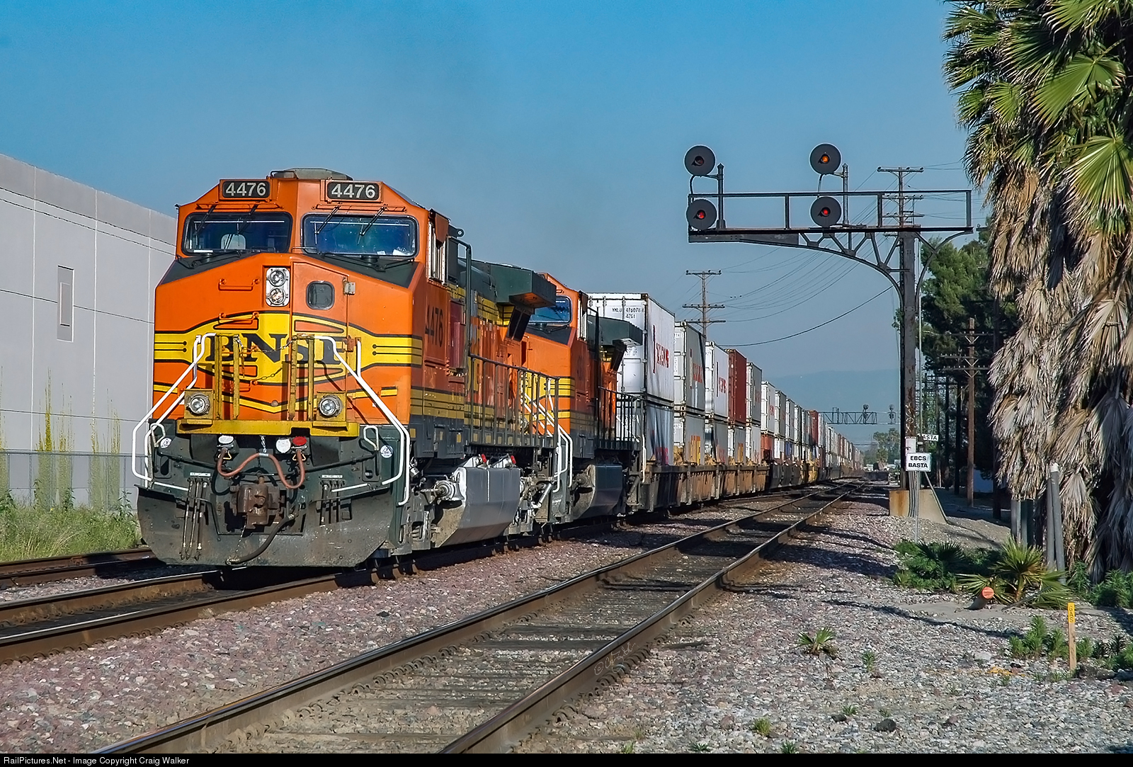 A westbound BNSF intermodal train rolls through Basta, the location where Union Pacific’s Anaheim Branch crossed the Santa Fe’s Third District, which these venerable cantilever signals protected. By this date, the UP no longer crossed what is now the BNSF San Bernardino Sub, and a portion of the old UP branch is now a storage siding for the BNSF. (Fullerton, California – April 6, 2005)