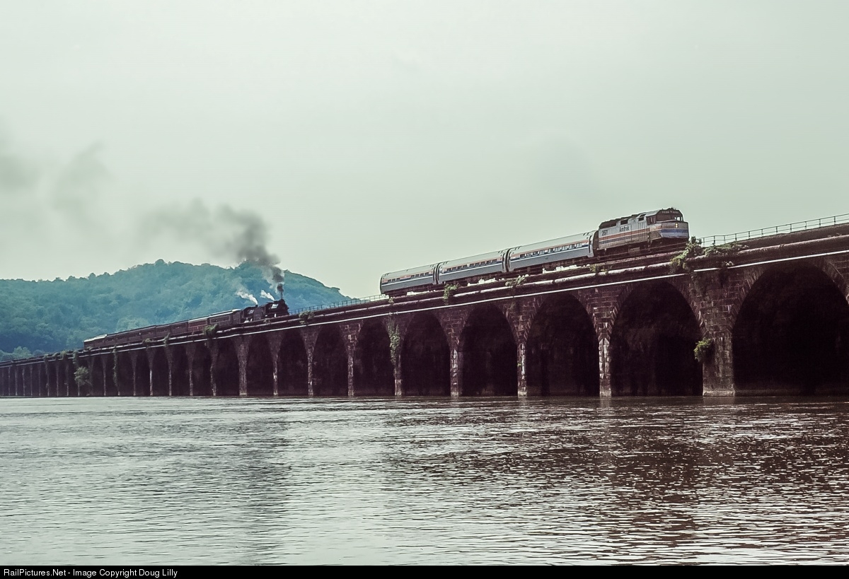 Passenger trains from two different times share the storied Rockville bridge on the former PRR Middle Division. Amtrak’s eastbound Pennsylvanian with a lone F40 and three cars is on time for arrival in Harrisburg. Farther away, two former PRR steamers, 4-4-2 7002 and 4-4-0 1223 have a ten car special from Strasburg, and are maneuvering to begin their return to Lancaster County.