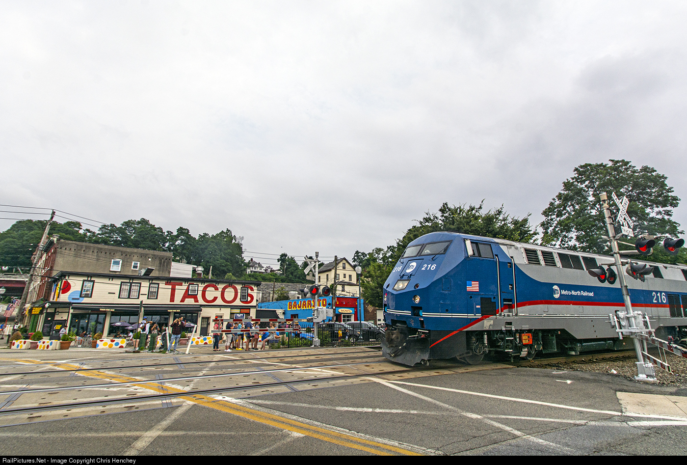 | An outbound Metro North train to Poughkeepsie slowly departs out of Peekskill, passing some of the colorful buildings and streetscapes along the tracks and riverfront. |