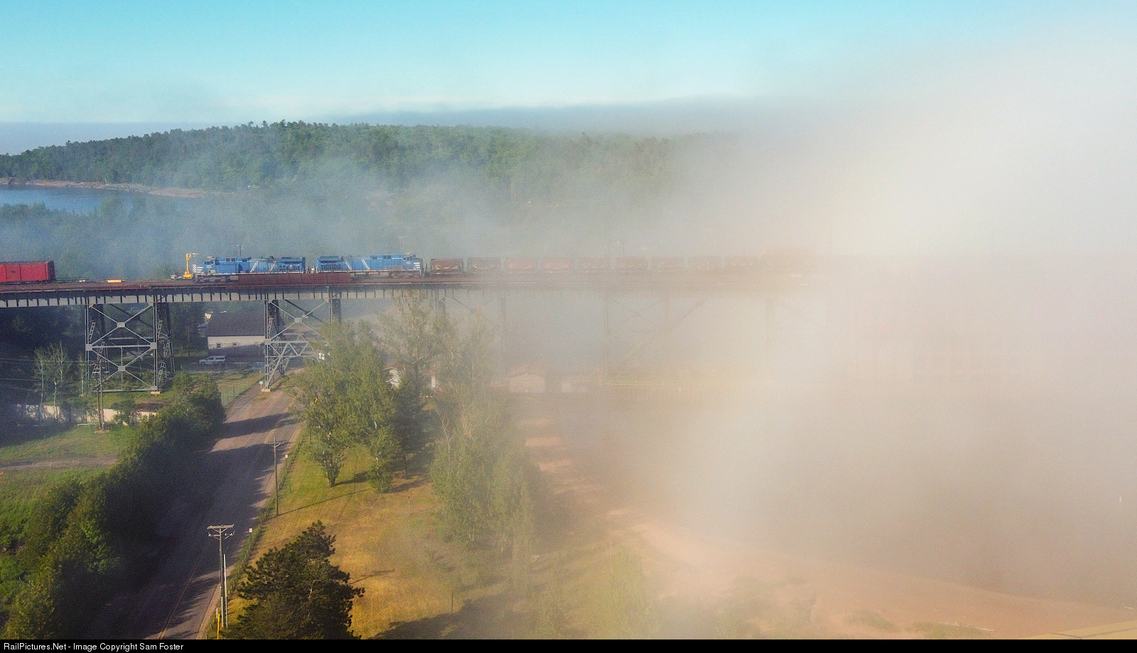 Two CEFX AC44s switch the LS&I’s ore dock in Marquette as a thick cloud of fog rolls off the lake.
