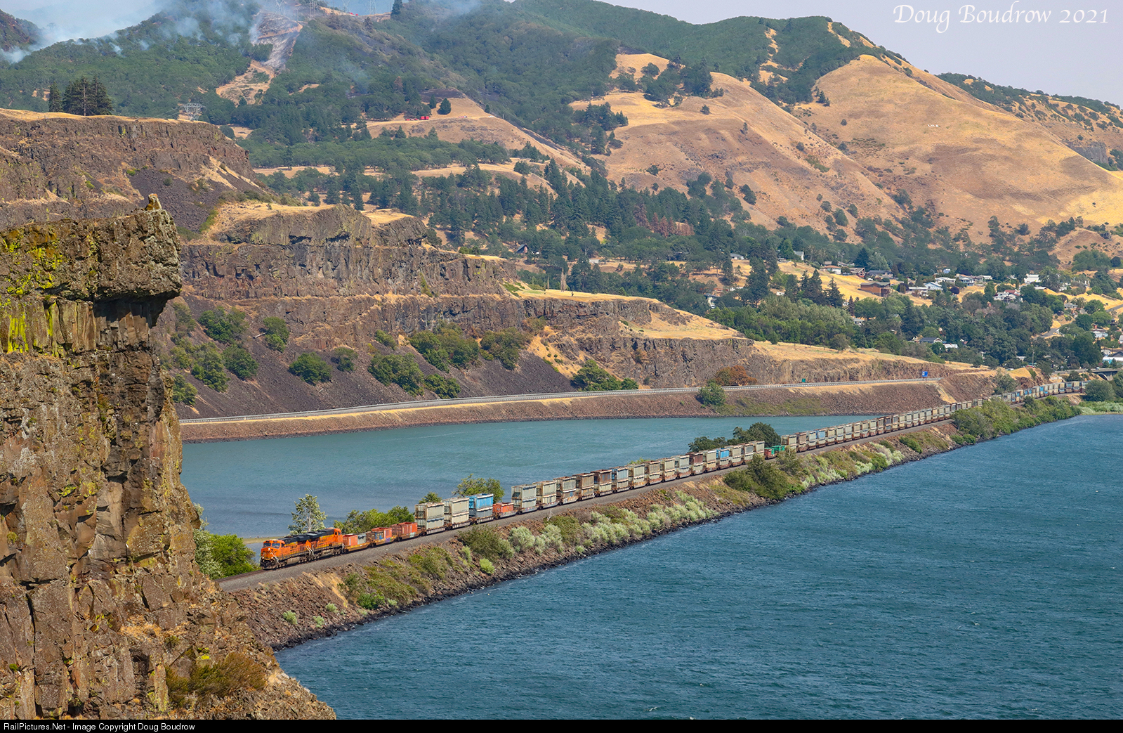 BNSF trash train H-ROOEVER (Roosevelt to Everett) is seen returning from the landfills in Roosevelt passing the basalt cliffs just West of Lyle as they cross Chamberlain Lake. Crews are fighting a wildfire on Lyle Hill in the background on Lyle Hill.