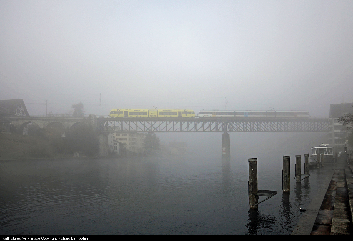 | At a misty morning two Thurbo articulated lowfloor trainsets "AKL" (long version) and "AK" (short version) are crossing the Rhine bridge Feuerthalen - Schaffhausen. The yellow one has a publictiy paint for "Radio / Tele Top", a local radio and TV station in Switzerland. |