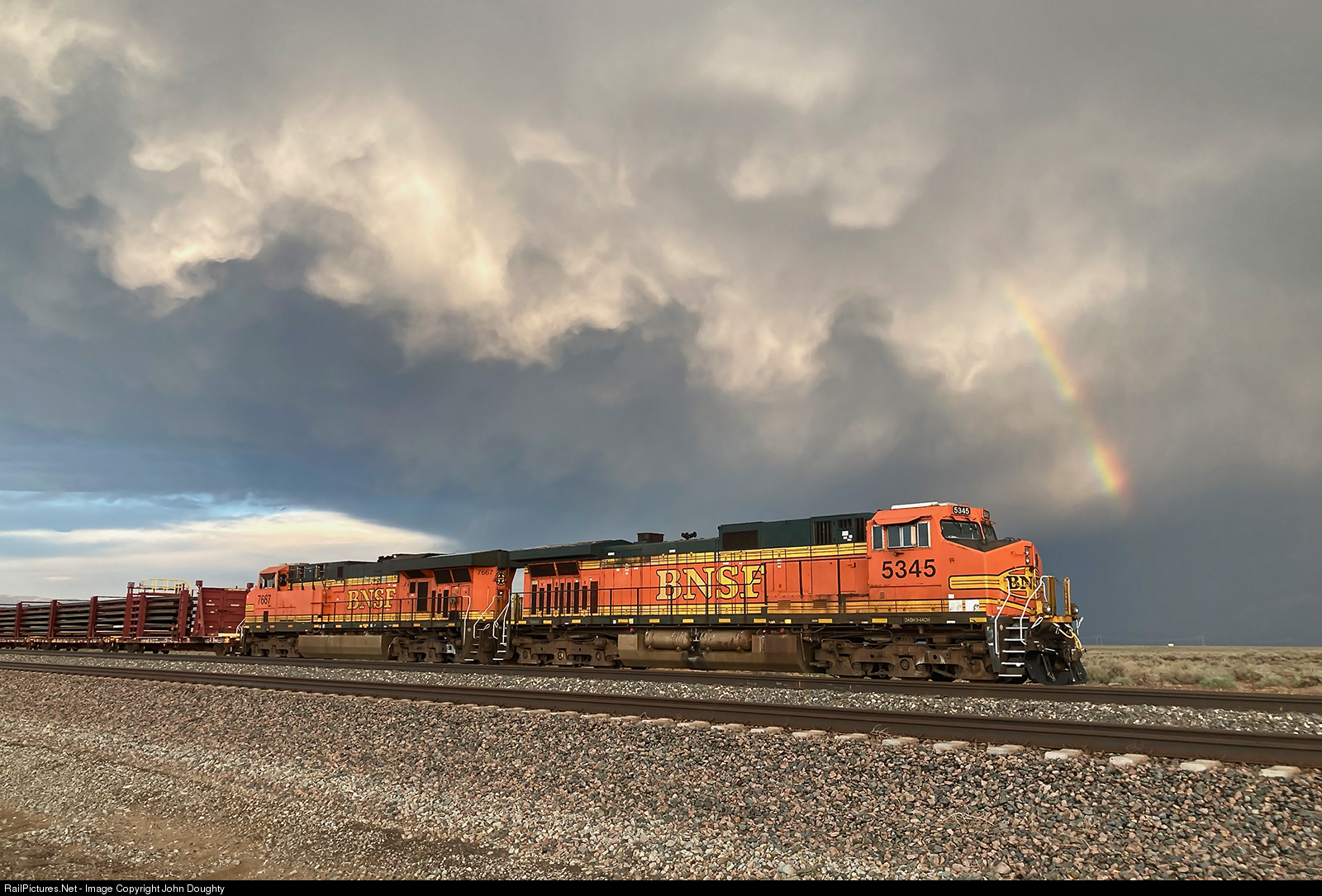 As a severe thunderstorm begins to clear the Dalies area and heads south towards Socorro, it displays a rainbow with dramatic storm clouds. BNSF 5345 and BNSF 7687 are tied down with a welded rail train. As the storm passed over the Dalies area, the dispatcher gave a high wind warning of 65 mph from the Belen yard out 91 miles to the west, causing two other westbound BNSF trains to hold at the Dalies summit. Once the storm began to clear, each was given a yellow signal to slowly proceed west.
