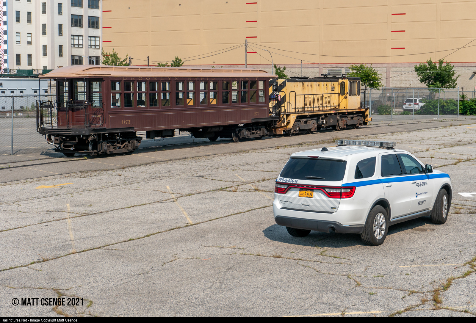 An NYCTA security officer is on duty at the South Brooklyn Marine Terminal keeping watch over BU gate car 1273 and locomotive 884 as they sit overnight awaiting a truck to come pick up the former. The car is to be loaded onto a lo-boy trailer so it can be used as a float in the "Hometown Heroes" ticker tape parade scheduled for tomorrow, 7/7/2021. The parade is to honor the essential workers that helped the city through the COVID-19 pandemic. The car will be used as a float for transit workers, 156 of whom were lost to COVID-19. |