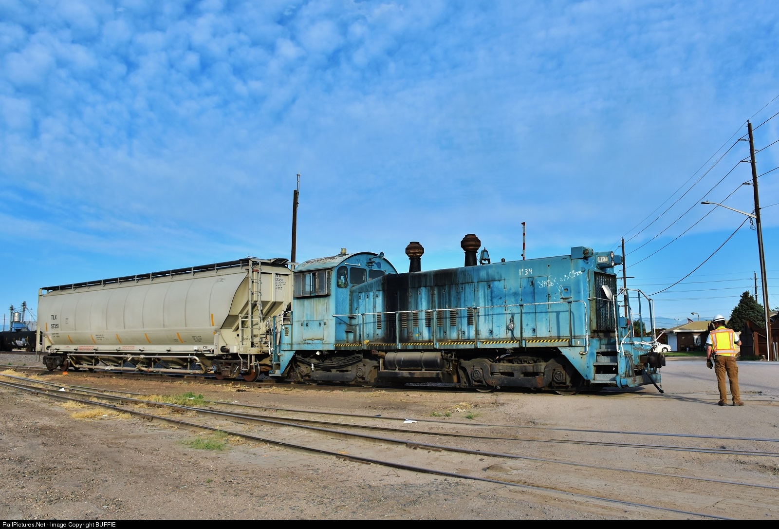 55 year-old Con Agra 1134 (SW1200) works the yard which is part of the Commerce City Grain complex in Commerce City, Colorado.