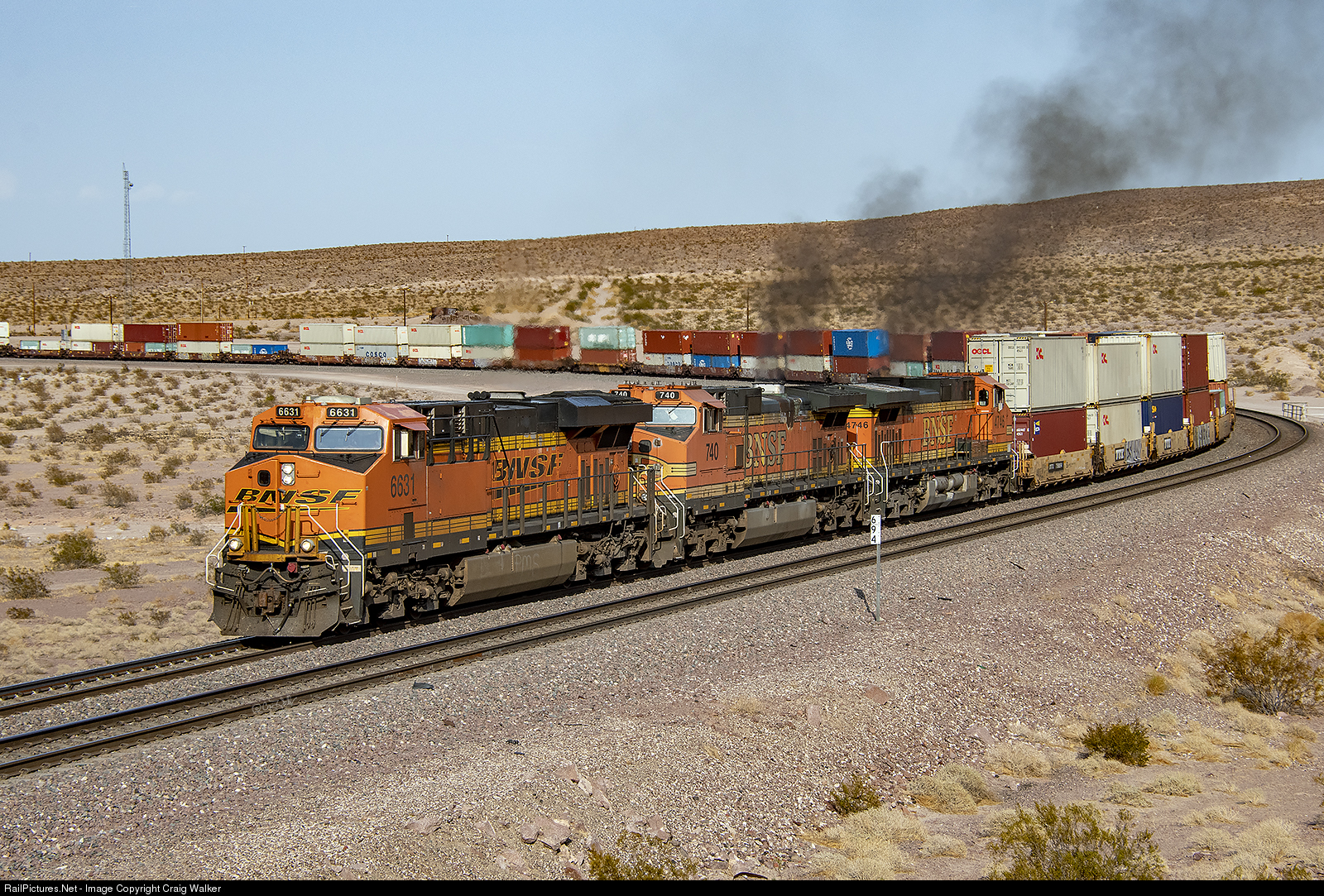 BNSF train S-PEASCO3-10, an Intermodal Stack heading to Long Beach CA from Pearland TX, rounds the curve at the west end of Ludlow, on the railway’s Needles Sub. This train is led by an ES44C4 (6631) and a pair of Dash 9-44CWs (740 and 4746) – BNSF 740 was one of the first three engines painted in the "Premium Heritage," or so-called "Heritage II" paint scheme (more orange, less green, a cigar band on the nose and large yellow initials on the hood, along with broad yellow and black stripes), when delivered in August 1997. These three engines (739, 740 and 745) effectively killed off the brief return of the red and silver "Superfleet" scheme, and also the "Heritage" scheme applied to the new power until early 1998. (Ludlow, California – July 14, 2021)