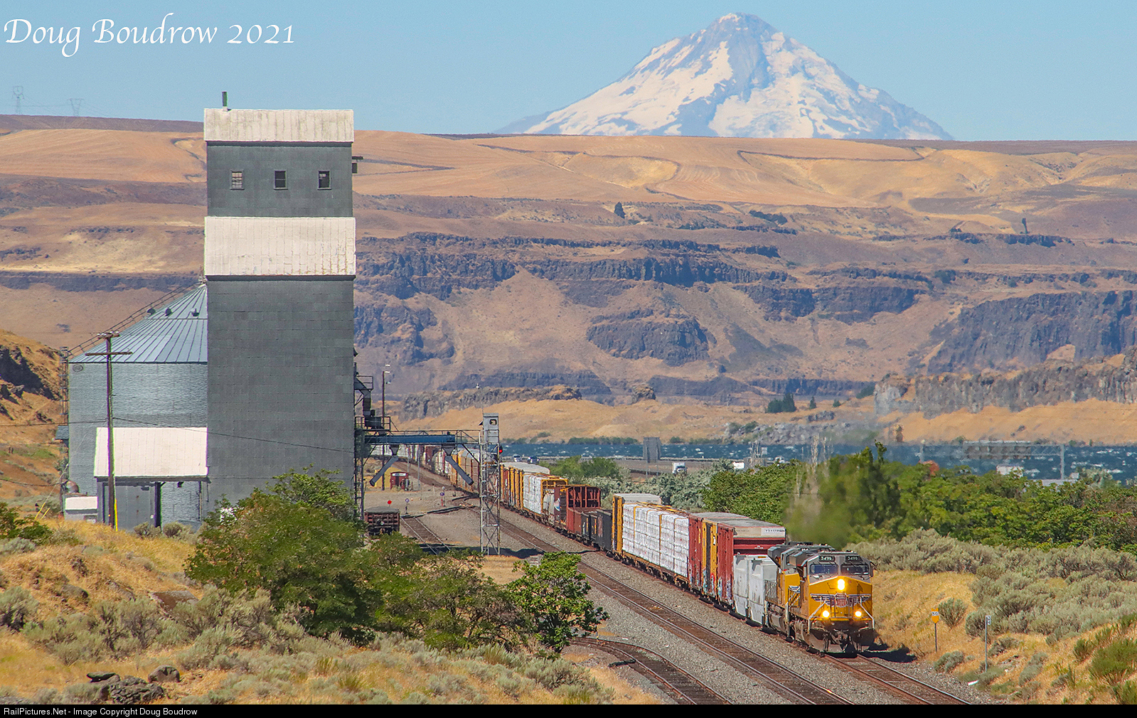 An Eastbound Union Pacific manifest freight train is seen passing through Biggs Junction and an abandoned grain elevator. The 11,250-foot peak of Mount Hood can be seen looming in the background.