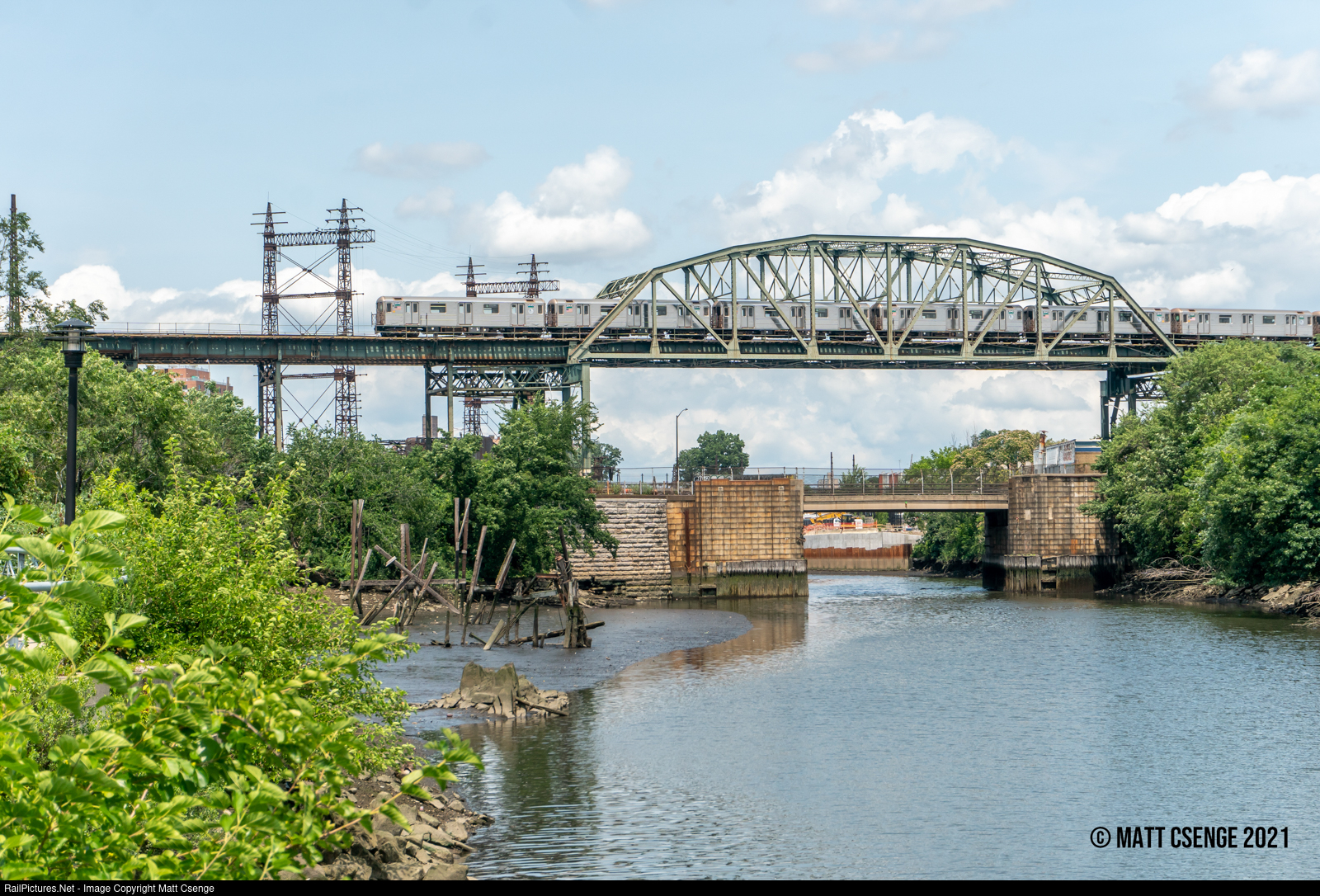 The towers in the background are part of the Bronx River Railroad Bridge, a moveable bridge on the Northeast Corridor. |