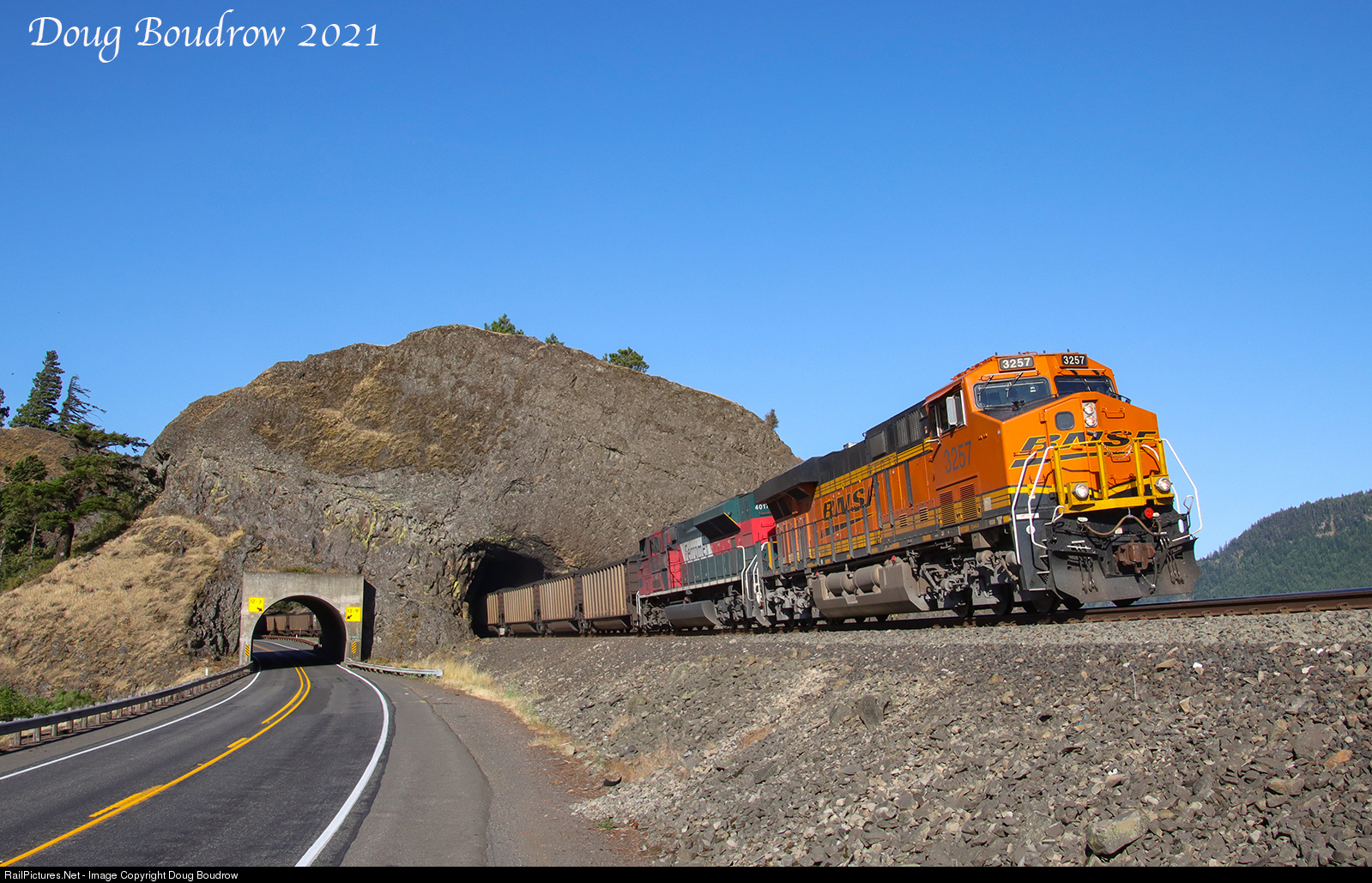 | BNSF coal train C-SXMRBG is seen passing through Tunnel 1 near Cook, Washington on the Fallbridge Subdivision along Columbia River Gorge. |