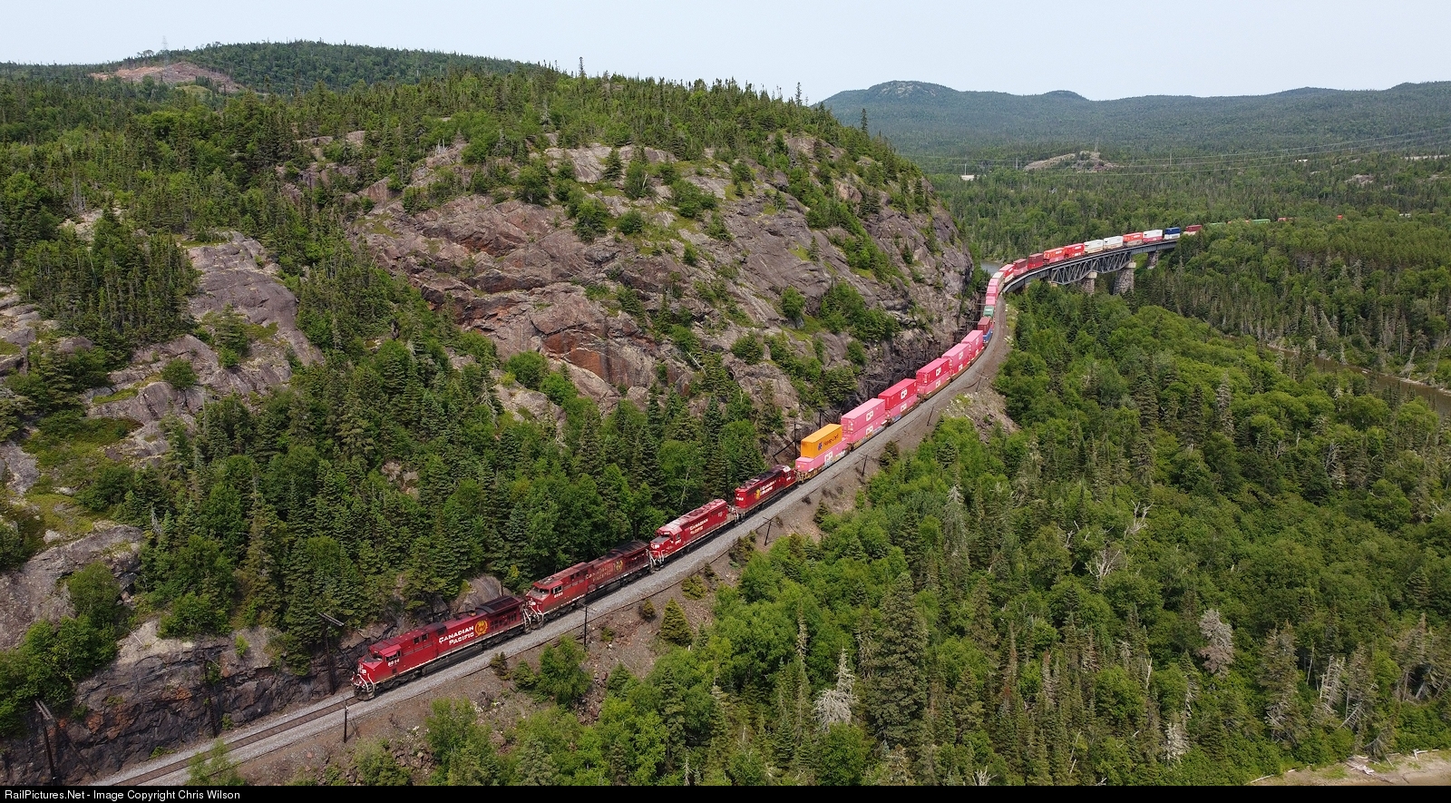 Toronto Yard, ON - Vancouver Coquitlam, BC train 103 with CP AC4400CWM 8014, CP AC4400CW 8556, + CP SD40-2's 5901 + 5792 are crossing The Little Pic River trestle, and along the granite rocks dotting Superior's shore.