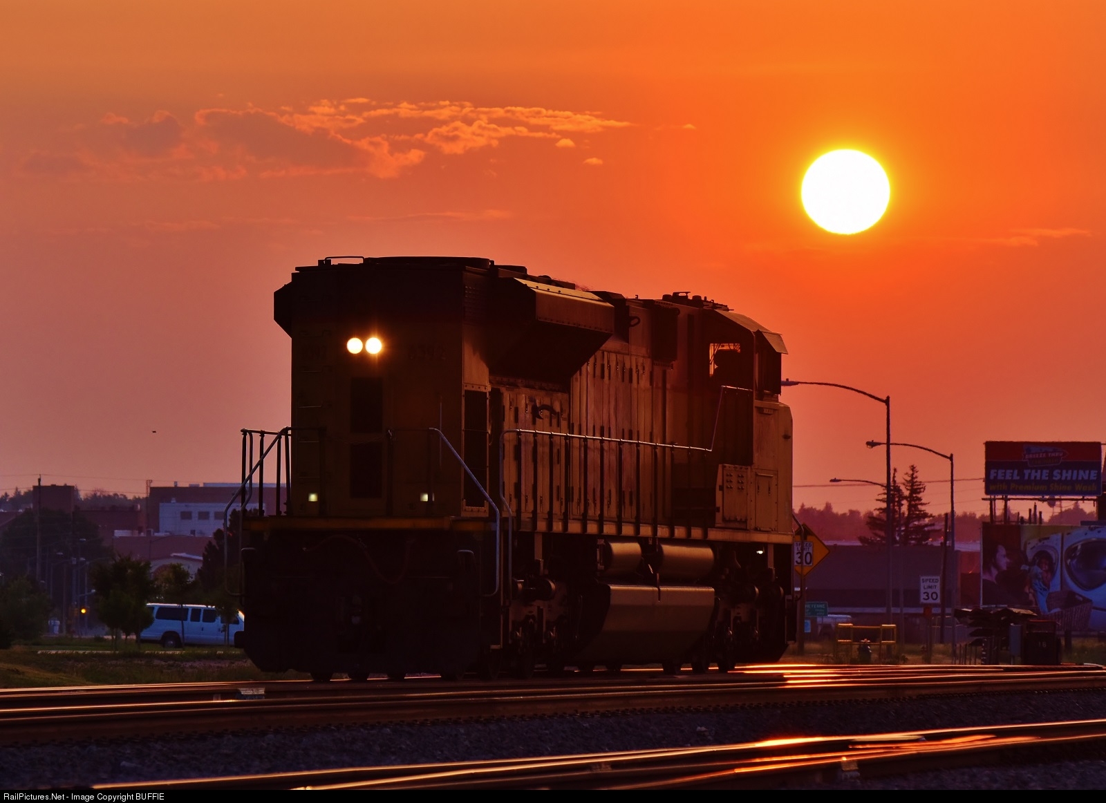 UP 8392 (SD70ACe) runs long hood forward at sunrise out of the Cheyenne Yard.