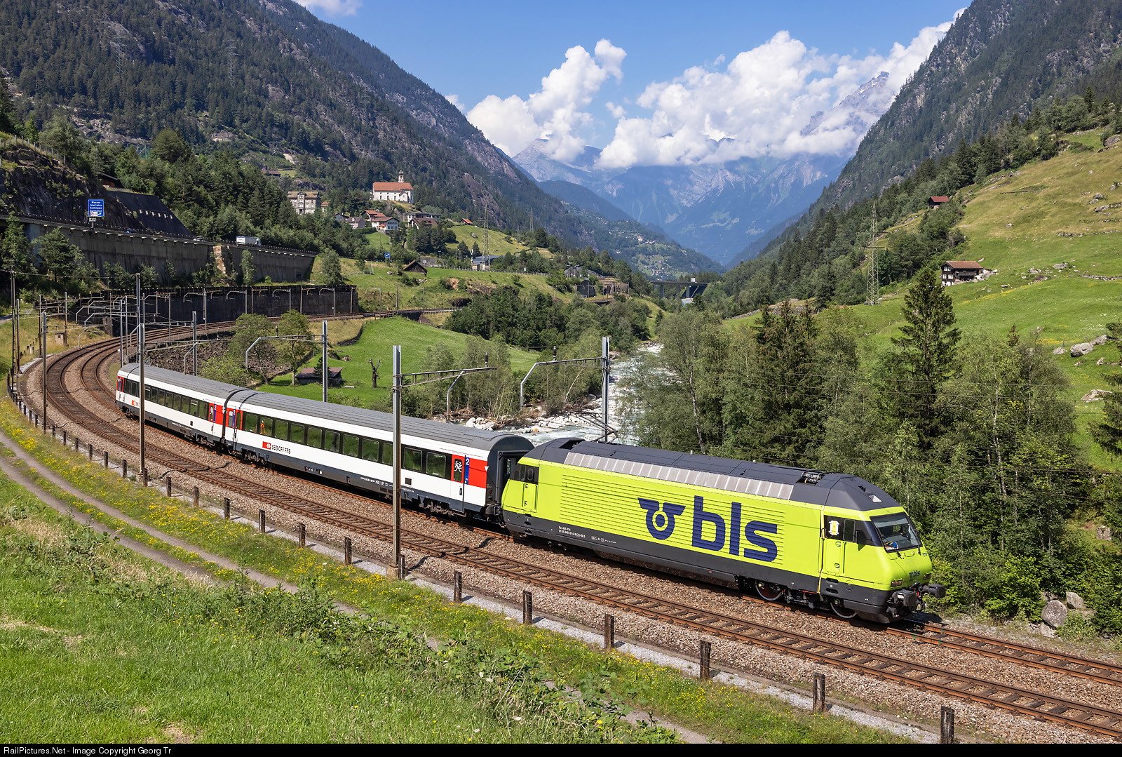 | This day, the Re 465 # 014 of the BLS made test runs on the Gotthard north ramp in behalf of SBB infrastructure. The locomotive was equipped with test wheels on two axles and two passenger cars (type EW IV) of the SBB served as brake cars. Test train 97427 from Erstfeld to Göschenen is running through the Wattinger curve between Gurtnellen and Wassen. |