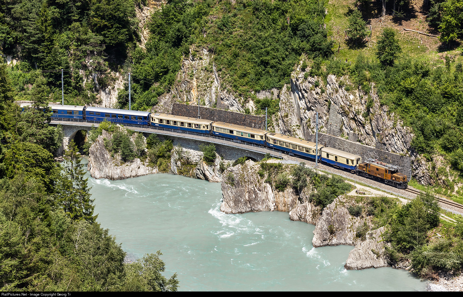 The ALPINE CLASSIC PULLMAN EXPRESS (ACPE), running for the 90th anniversary of the GLACIER EXPRESS 1930 to 2020, postponed due to Covid-19 from 2020 to 2021, is running through the gorge of the Vorderrhein between Trin and Reichenau-Tamins. The train 2740 came from Andermatt this day and is going to St.Moritz. The Ge 6/6 I # 414 of the Rhaetian Railway is pulling the train from Disentis to Chur and from Chur via the Albula to St.Moritz. The cars are baggage D # 4051, parlor car As # 1143, Piano-Bar WR-S # 3820, parlor car As # 1144, blue dining cars WR # 3813 and WR # 3811 (in the train between Disentis and Chur). The 4 day journey was from the Gornergrat via Zermatt-Andermatt-Disentis-Chur-St.Moritz to Tirano. All vehicles dates from about 1930, and are so old as the brand GLACIER EXPRESS.
