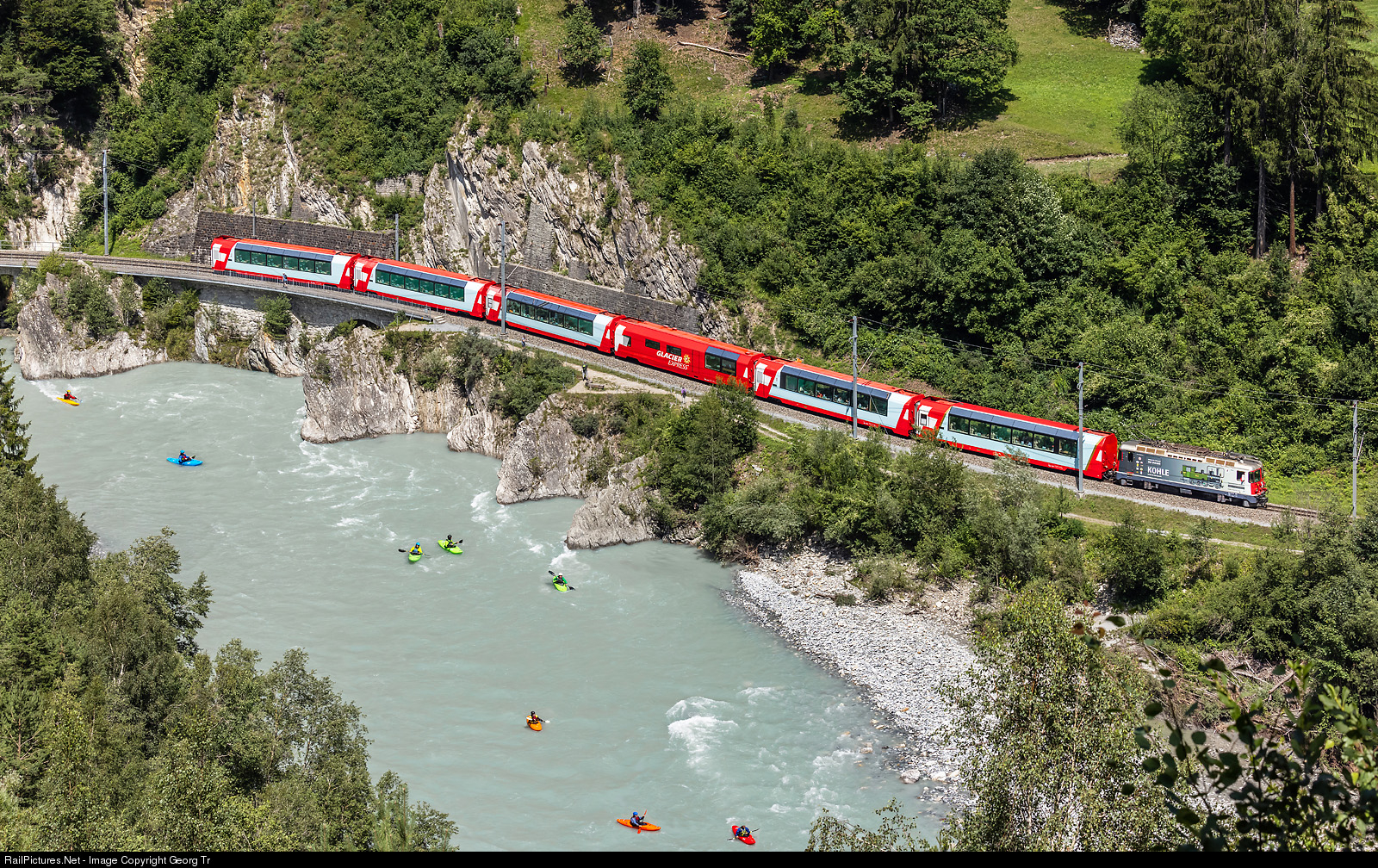 Ge 4/4 II # 616 of the Rhaetian Railway, in the publicity paint scheme for collecting donations for steamlocomotive G 3/4 # 1 "RHAETIA", is pulling the PE 902 GLACIER EXPRESS Zermatt-St.Moritz through the gorge of the Vorderrhein between Trin and Reichenau-Tamins. First car is Aps # 1321 "Excellence Class". The Vorderrhein is very popular for canoeing and rafting.