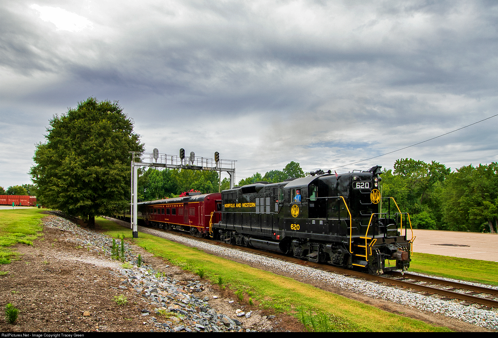High Hood Reversing. Running the day's passenger train, the N&W reverses the train here underneath the old Southern Railway signals on the museum grounds.