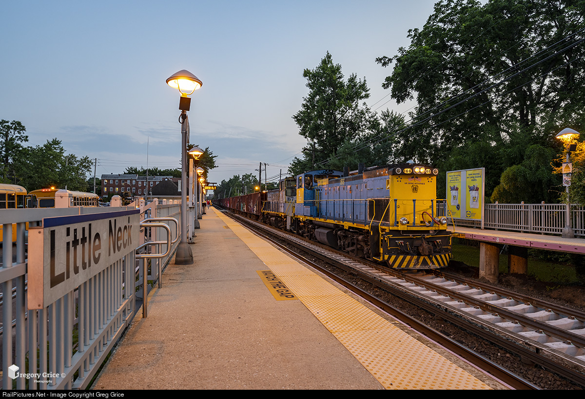 Just after sunset on July 19th, 2021, Long Island Rail Road Extra 166 idles at Little Neck Station on the Port Washington Branch with a loaded stone train in tow. The stone extra is dropping fresh ballast on "Port Wash 1" in support of new track that was recently laid between BAY & NECK Interlockings.