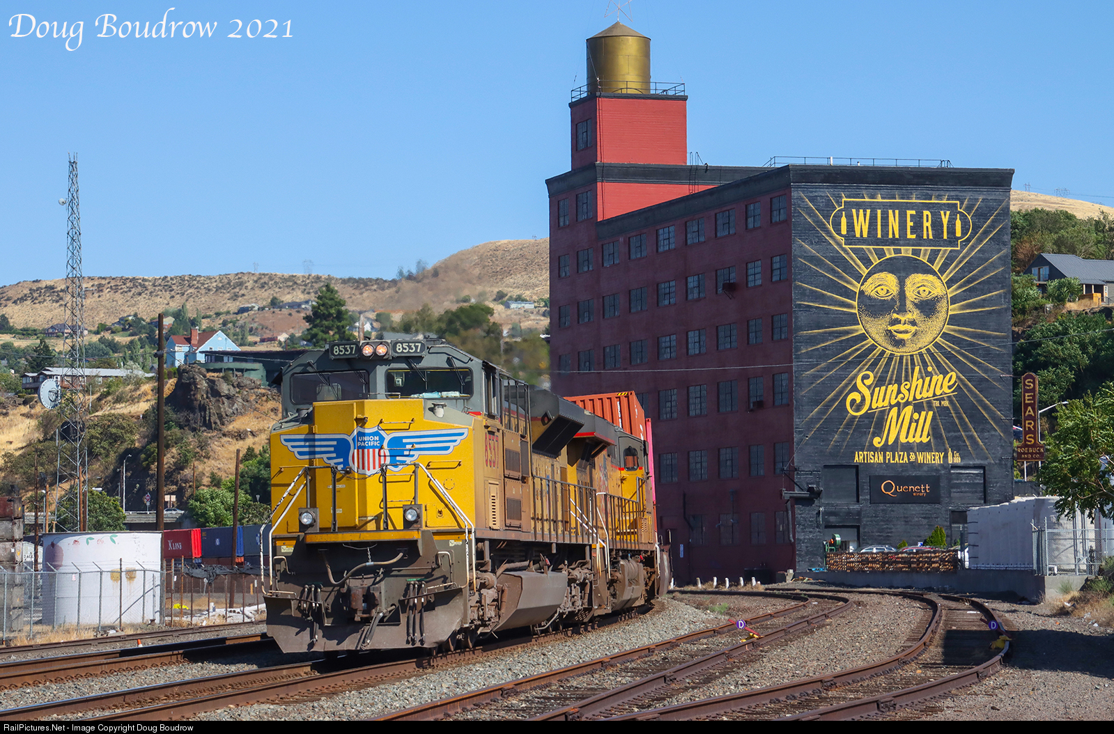 | The rear DPUs on an Eastbound Union Pacific priority intermodal train pass through The Dalles, Oregon passing the historic mill complex. The Sunshine Mill Winery occupies the site of the over 130-year-old Sunshine Mill, originally owned by the Sunshine Biscuit Company. This structure was the first in The Dalles to have electricity, powered by a Thomas Edison motor that is still on display inside the building. The wheat milled here was once used to make Cheez-Its. The winery has used the property since 2009. |