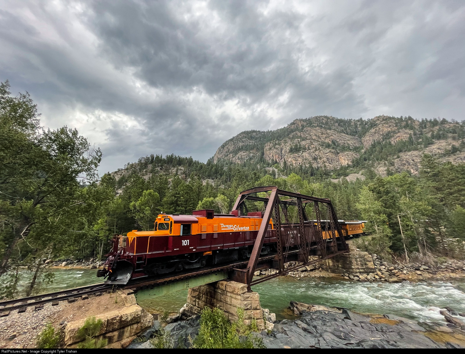 The fresh paint of one of D&S' ex-White Pass Alcos contrasts with the stormy skies as train 462 crosses the Animas River just above Cascade Canyon, headed south for Durango.