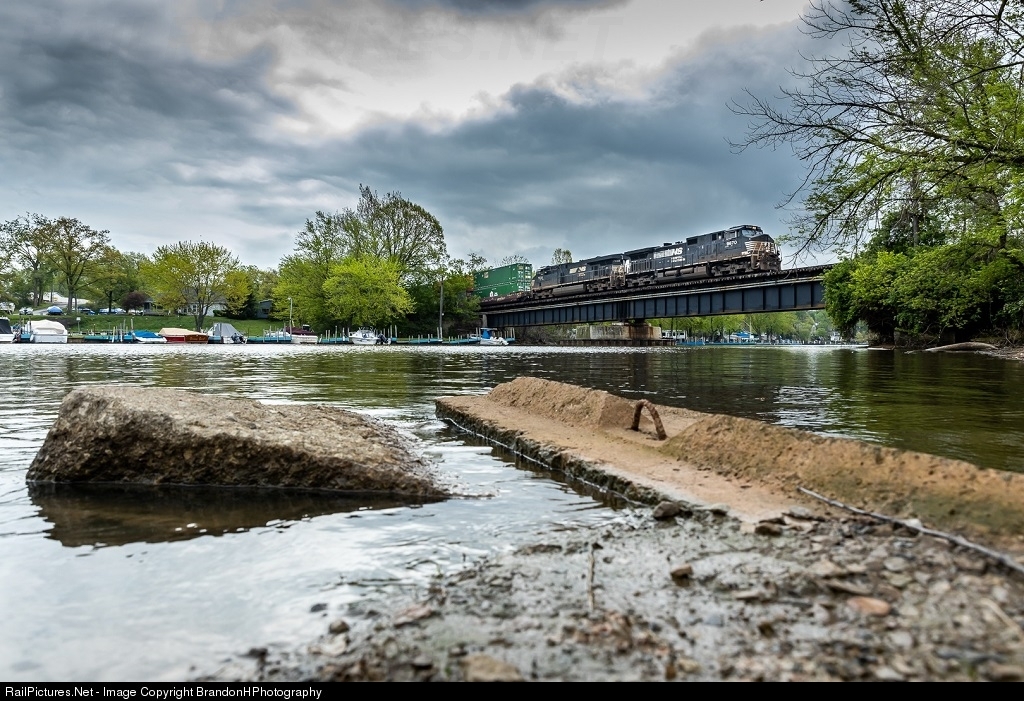 | NS 23K Flies over the Vermilion River in Vermilion Ohio with stacks bound for Chicago, this would be one of the last 23Ks I would manage to photograph before NS would reroute them over the Chicago Line. |