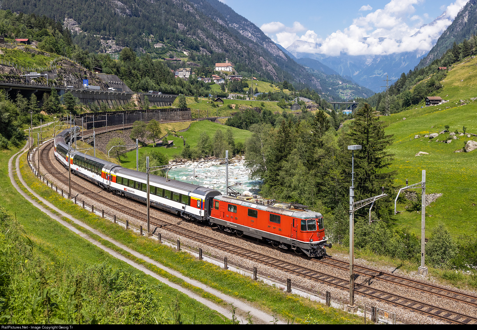 | Re 420 # 199 (Re 4/4 II # 11199) of the SBB is pulling the train PE (Panorama Express) 3093 GOTTHARD PANORAMA EXPRESS from Arth Goldau via Flüelen-Gotthard mountain line-Airolo-Bellinzona to Lugano, through the "Wattinger curve" between Gurtnellen and Wassen. The train, which can only be used with a first class ticket and an additional supplement, has a total of 6 passenger cars. One first class Apm (mainly used for material and the staff), 4 panorama cars Apm in special "GOPEX" paint and one second class car "B50" with windows to open for better photos. In the background village and church of Wassen. The river Reuss has more water then usual after much rain the week before. |
