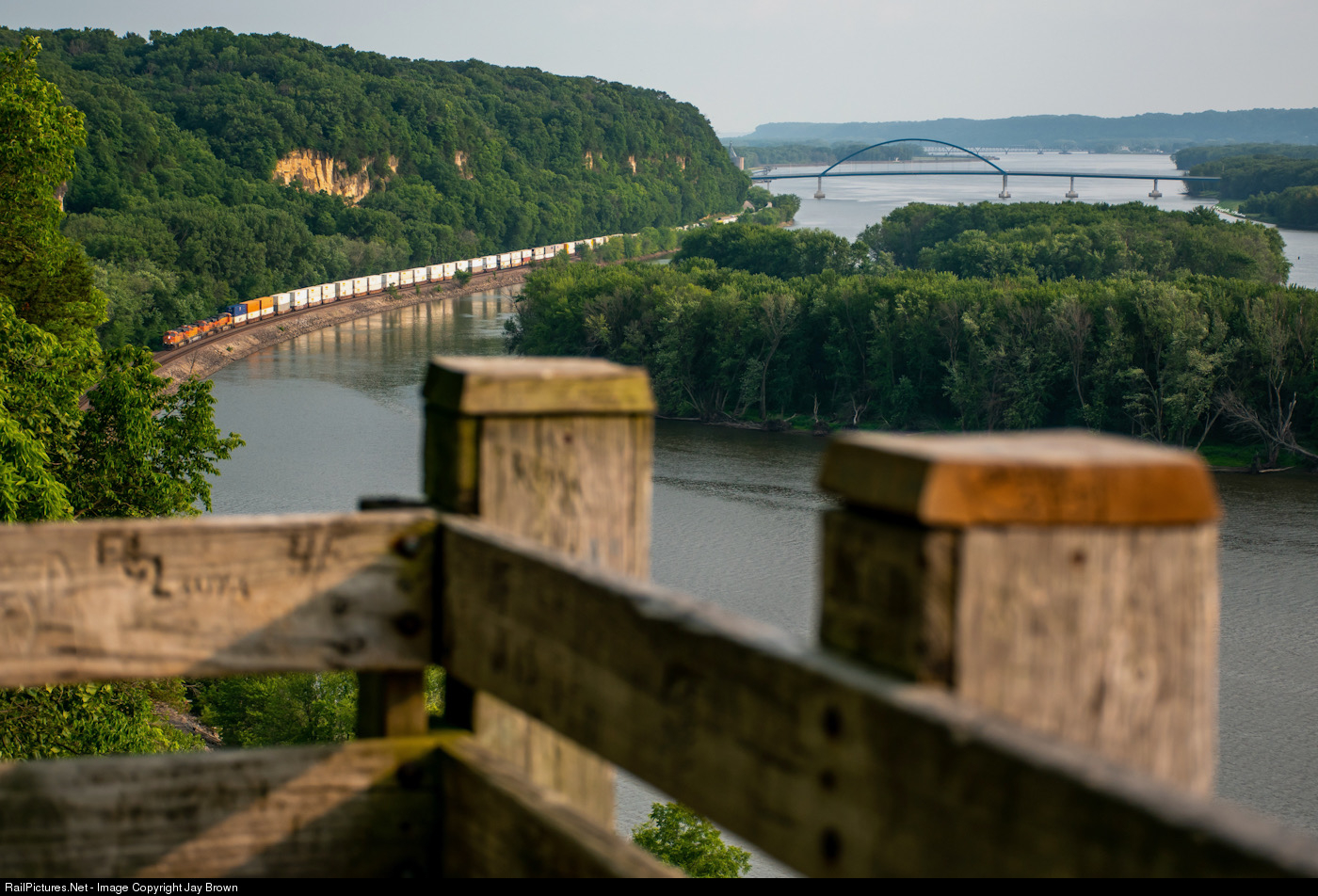 The evening Seattle stack flies along the Mississippi River with four of BNs attention grabbing GEs up front… seen here from the Mississippi Palisades State Park.