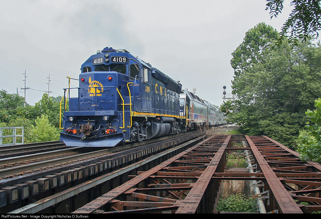 For a brief 36-hour period, NJT 4109 (NJ Transit CNJ Heritage Unit) was temporarily reassigned to home rails on the ex-CNJ Raritan Valley Line. This was done to honor the last CNJ engineer on the roster, Frank "Jethro" Strunk, who retired on July 20th. Having been attached to this consist at Raritan, the train is charging east to Newark Penn Station on Jethro's penultimate run. The engine began its life as CNJ 3677 making it one of the few heritage locomotives to come from the railroad that its livery conveys.
