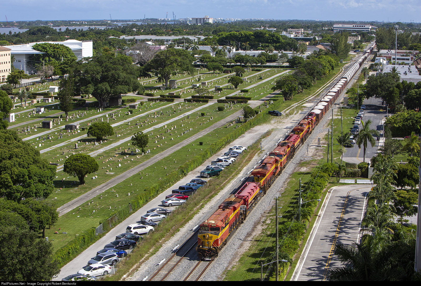 FEC train 202 with an impressive set of power (two ES44C4-LNG tender sets and an ex-UP SD40-2 for good measure) passes milepost 300 (from Jacksonville) in downtown West Palm Beach, FL. The Norton Art museum is on the left, with the roof canopy encompassing a mammoth ficus tree.